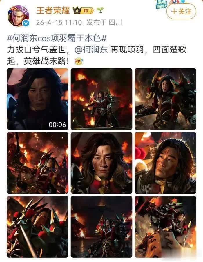 最具戏剧性的联动发生在虚拟与现实之间。4月15日,《王者荣耀》官方高调宣布与何润东联动项羽皮肤,配文“啊,是西楚霸王来了!”。从被网友调侃“别去代言弹窗广告游戏”到喜提国民级手游的正式商务,何润东只用了不到一周。
